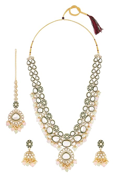 Pink Green Beads Dazzling Stones Meenakari Bridal Long Necklace Earring & Maangtikka Set
