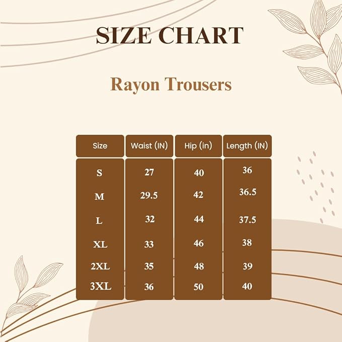 • Made from premium rayon fabric, these trousers offer a soft, lightweight, and breathable feel all day.