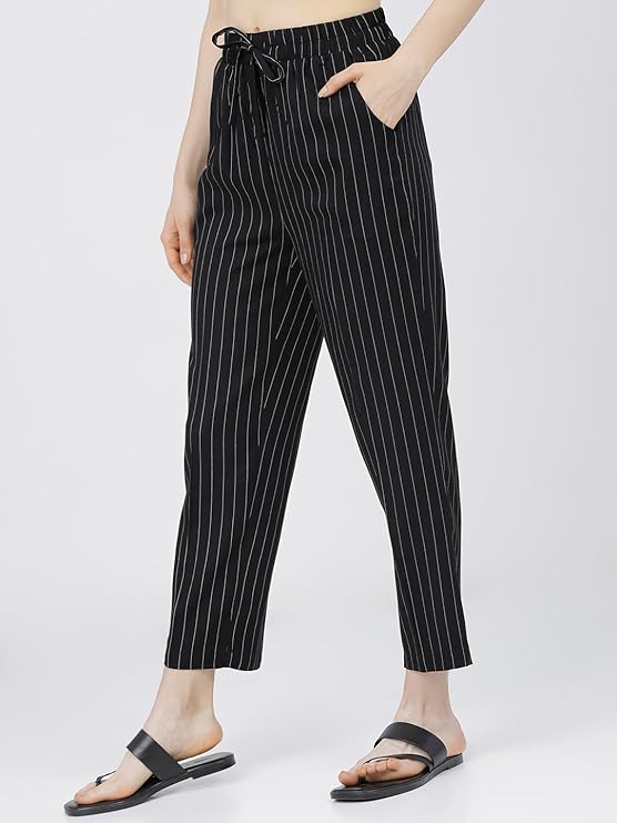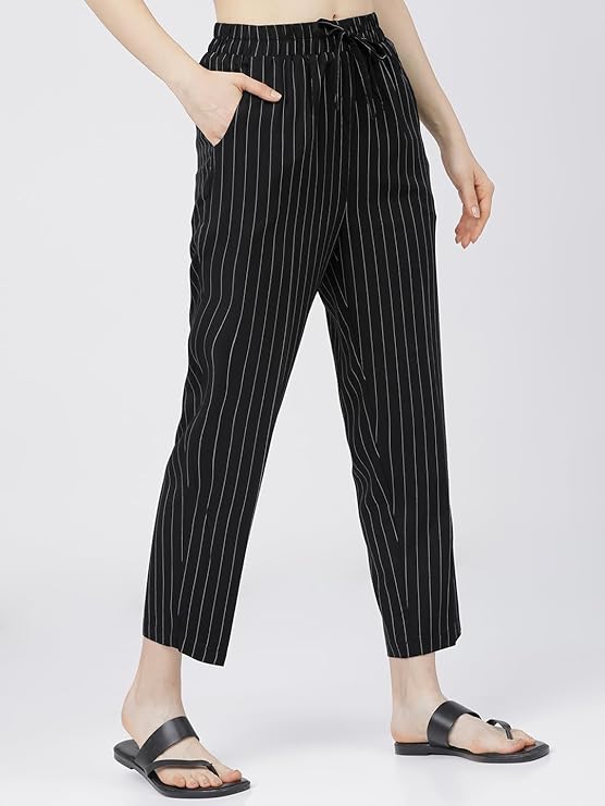 • 📝🛍️ Product Description: These Striped tapered pleated trousers offer a flattering fit with a stylish pleated design and tapered leg. The crisp pleats add a touch of sophistication, while the hue makes them versatile for various styling options. Whether you’re heading to the office or a casual outing, these trousers combine comfort with elegance