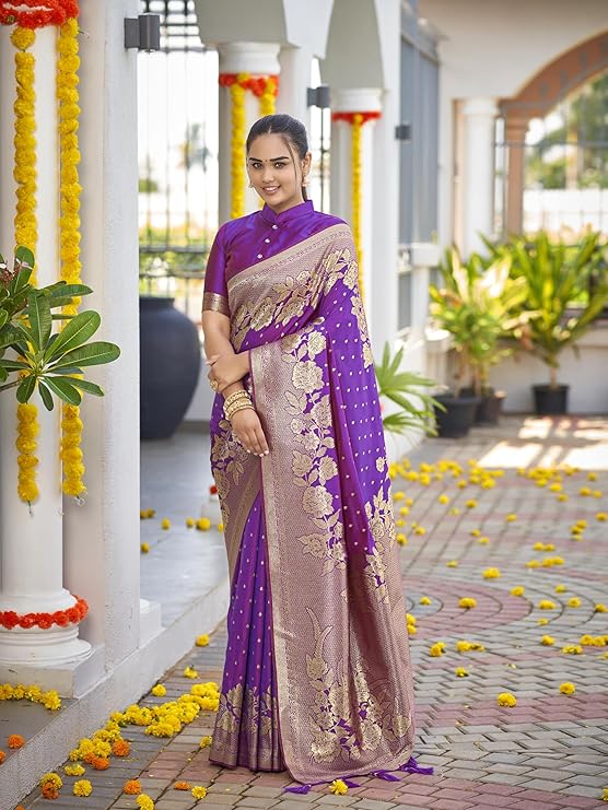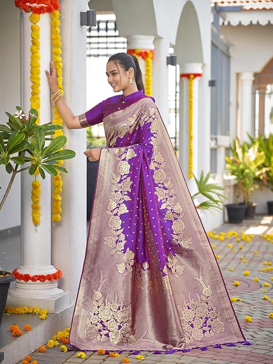 Women’s Trendy Banarasi Woven Saree with Heavy Jacquard Work, Elegant Design, Silk Saree with Maching Lace Border Unstitched Blouse Piece for Weddings & Festive Occasions