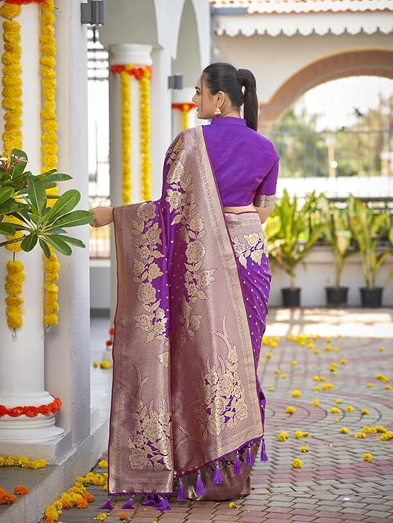Women's Trendy Banarasi Woven Saree with Heavy Jacquard Work, Elegant Design, Silk Saree with Maching Lace Border Unstitched Blouse Piece for Weddings & Festive Occasions