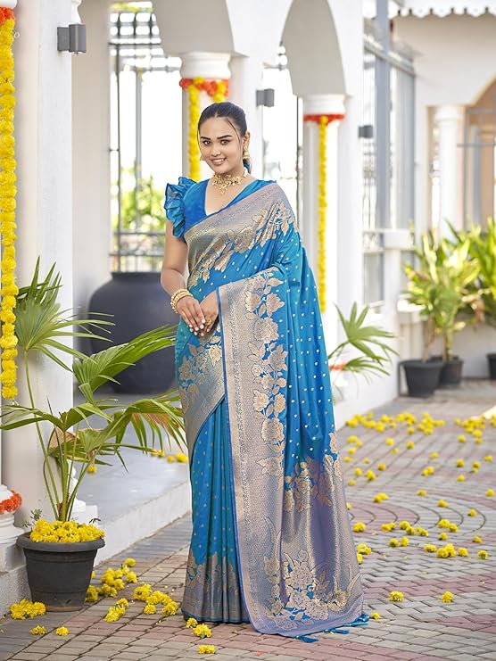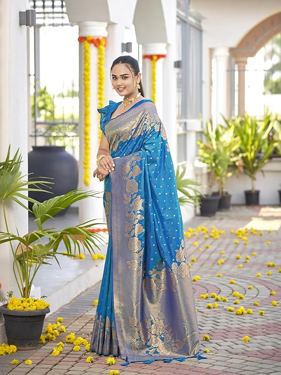 Women’s Trendy Banarasi Woven Saree with Heavy Jacquard Work, Elegant Design, Silk Saree with Maching Lace Border Unstitched Blouse Piece for Weddings & Festive Occasions